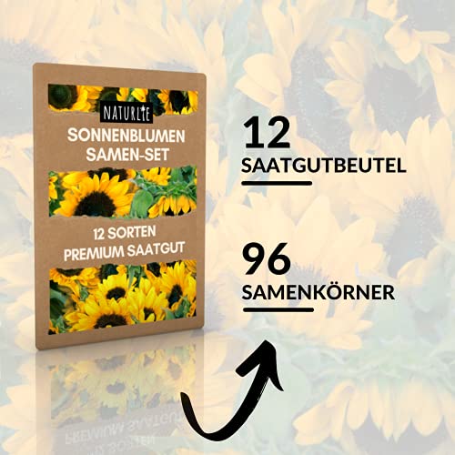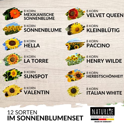 🌻 12er SONNENBLUME PFLANZENSET: Große Vielzahl im Blumenset. 12 verschiedenen Sorten u.a. Mexikanische Sonnenblume, Hella, La Torre, Sunspot, Valentin, Paccino, Henry Wilde, Italian White.