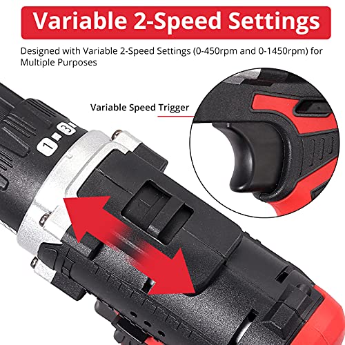【2 Geschwindigkeitsregler und Stufenlose Geschwindigkeitsregelung】Der Bohrer ist mit variablen 2-Gang-Einstellungen ausgelegt. Langsamer Gang 0-450 U / min / schneller Gang 0-1450 U / min. Kann eine Vielzahl von Arbeitszwecken erfüllen.