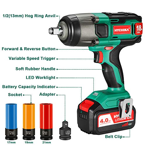 🌟【Packliste】1 x HYCHIKA 18V aufladbare Batterie Schlagschrauber, 1 x 4,0 Ah Lithium aufladbare Batterie, 1 x Schnellladegerät, 3 x Schlagbuchsen (17/19/21mm), 1 x Zwischenstecker (Umbau von 13 mm auf 10 mm), 1 x Werkzeugkasten, 1 x Benutzerhandbuch.