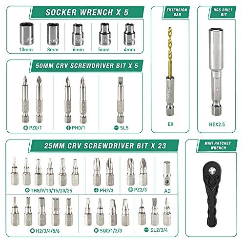 🌟[36 ZUBEHÖRTEILEN MIT RATSCHLÜSSEL] Mit 36 Zubehörteilen eignet es sich zum Befestigen und Lösen aller Möbelschrauben, der Ratschenschlüssel eignet sich für enge Räume, in denen das Gerät nicht verwendet werden kann. Die Spindel hat eine selbsthemmende Funktion, die bei manueller Verwendung ein höheres Drehmoment liefert. HINWEISE: 25 mm Bits sollte mit Verlängerungsstange verwendet werden.