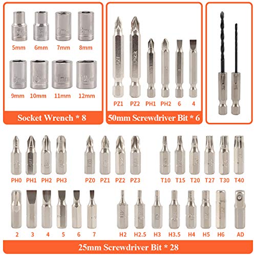 【Umfassendes Zubehör-Kit】Umfassendes Zubehör-Kit, einschließlich der am besten für die Auswahl von Holz-, Metall- und Mauerwerksbohrern usw., die am häufigsten für Schrauben und Schraubendreher zu Hause und im Büro verwendet werden, in einer haltbaren Tragetasche, die die Teile sauber hält. organisiert und leicht zu finden. Ein unverzichtbares Set für Heimwerker.