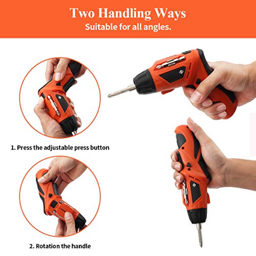 【Zwei Handhabungsmöglichkeiten】Der Bohrschrauber verfügt über einen Drehgriff, der durch Drücken des einstellbaren Druckknopfs in zwei Positionen eingestellt werden kann und für sämtliche Winkel angebracht ist, vulgo auf engstem Weltraum. Der mit weichem Gummi überzogene Griff bietet Ihnen ein angenehmes Griffgefühl und abzgl. Ermüdung bei den meisten alltäglichen Aufgaben