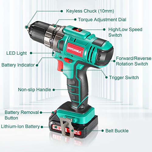 🌟【WAS SIE ERHALTEN】 1 x 12V HYCHIKA Akkuschrauber, 22 x Zubehörteile, 1x 12V 1500mAh Lithium-Ionen Akkumulator, 1 x Schnellladegerät, 1 x Gürtelschnalle, 1 x Werkzeugtasche, 1 x Tragetasche, 1 x Benutzerhandbuch, 1 x Lebenslanger Service