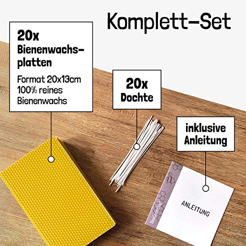 ✓【 Mit allen Schikanen-Set anstelle bis zu 20 Kerzen 】: Im Bastelset enthalten sind 20x Bienenwachsplatten (in der praktischen Größe 20x13cm), 20x passende Dochte und eine Anleitung.