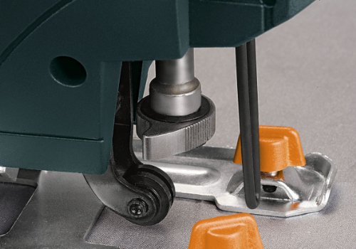 Werkzeugloser Sägeblettwechsel mittels Quick-lock, Softgriff, Umdrehungsfrequenz-Regelelektronik mittels Drehzahlvorwahl, 4-fach verstellb. Pendelhub, Sägeschuh solange bis 45° dahinter sonst u. a. dexter schwenkbar, Staubabsaugung anhand Passstück, Sichtschutz.