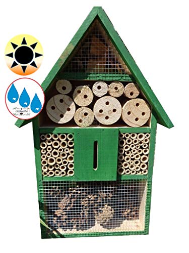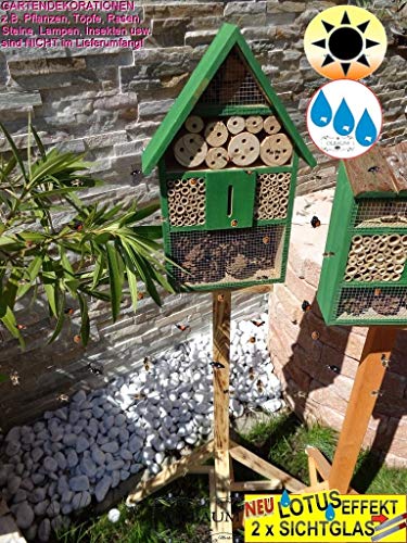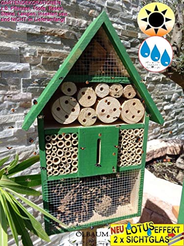 GANZJÄHRIGE Wildbienen- und Insektennisthilfen („Insektenhotel“ XL 50 cm) für Metamorphose und Überwinterung, LOTUS-EFFEKT + 1 x Beobachtungsröhrchen, mit Naturmaterialien, Farbe GRASGRÜN, Vollholz massiv, PFLEGELEICHT mit Abperleffekt