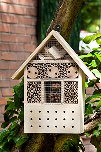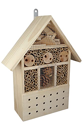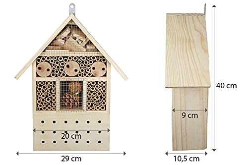 Abmessung: Das Bienenhotel in Form eines Hauses ist inkl der Aufhängevorrichtung 40 cm hoch, 29 cm breit und 10,5 cm tief.