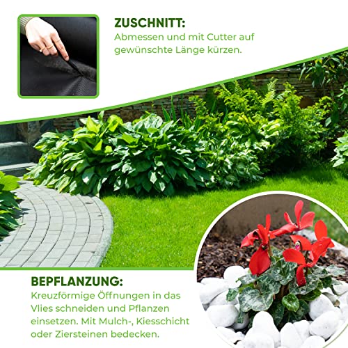 EINFACHE HANDHABUNG + VIELFÄLTIG EINSETZBAR – Ob als Vlies für Steingarten, Rasenvlies, Mulchfolie / Mulchvlies, Dachbegrünung Vlies, Geotextil oder Unterbodengewebe – Unkrautflies auf Rolle für den Garten, Kiesweg und die Terrasse schnell & einfach überall verlegen und mit beiliegenden Erdankern befestigen