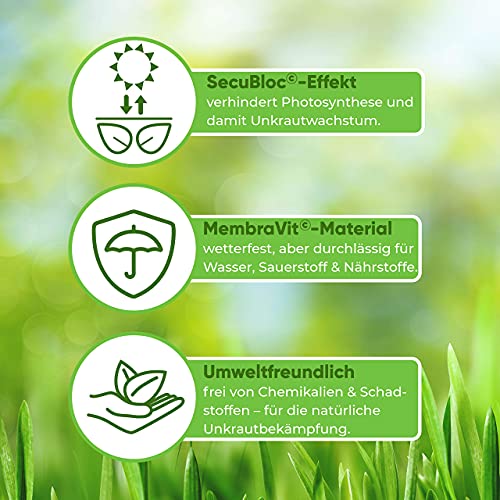 SECUBLOC-EFFEKT + MEMBRA-VIT-MATERIAL – Reißfeste Unkrautvlies Oberfläche mit maximaler Langlebigkeit & Strapazierfähigkeit durch spezielle Gewebe- & Faserstruktur des hochwertigen Polypropylen Stoffes. Ganz und gar UV beständig & reißfest. Pflanzenvlies wasserdurchlässig & umweltschonend