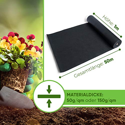 Unkrautvlies 150g/m2 1m besoffen & 50m lang – 50m2 – Höchst effektiver und natürlicher Handlanger gegen Unkraut und für optimales Wachstum, nicht mehr da ohne Chemie und mühseliges Jäten! Unkrautschutzvlies inklusive 50 verzinkter Erdanker Bodenanker