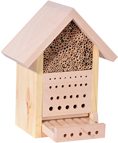 Qualität/Material des Nützlingshotel: Luxus Bienenhaus aus hochwertig glatt gehobeltem Buchenholz (Dach und Nistblock-Vollholz), Kiefernholz (Wände und Boden), Schilfrohrhalme (Nisthalme), Acrylglas-Schublade zum Beobachten