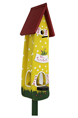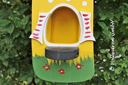 Der 61 cm hohe Futter- und Nistturm gewinnt durch den 1,80 m Holzpfahl weiter an Größe. Ein wunderschöner Futterplatz im Winter wie Sommer, der aus drei Himmelsrichtungen anzufliegen ist, da drei großzügige Bogentore zum Körnerspeicher führen.