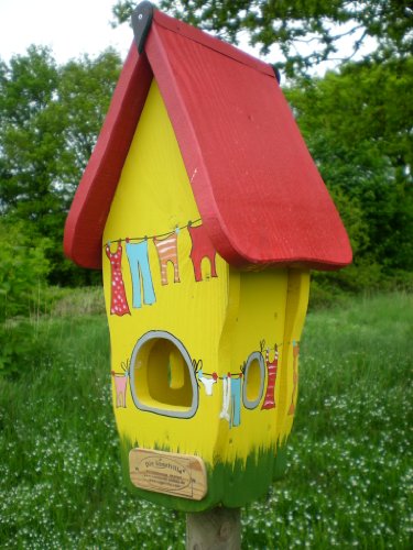 ausschließlich mit heimischen Hölzern; Douglasie oder Edeltanne, sowie vogelfreundlichen Acrylfarben auf Wasserbasis.