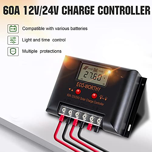 [60A 12V/24V PWM-Laderegler]: Der intelligente Laderegler ist an Stelle Blei-Säure-, Gel- und Lithiumphosphat-Batterien passend. Der ECO-WORTHY Laderegler verfügt über Kurzschluss-, Leerlauf-, Rückwärts- und Überlastschutz, verbessert die Effizienz des Solarsystems und verlängert die Lebensdauer der Batterie. Das LCD-Display zeigt den Status und die Daten an. Jedoch ist der Laderegler passend an Stelle Privathaushalte, Industrie und Gewerbe.