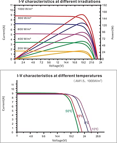 [Technische Daten] Nennleistung(Pmax): 150W — max. Abenteuer(Vmp): 18,5V — Max. Strom(Imp): 8,12A — Leerlaufspannung(Voc): 22,80V — Kurzschlussstrom(Isc): 8,77A — Max. Systemspannung: 1000VDC — Betriebstemperatur.: -45°C bis +85°C — Dimension : 1240*670*35mm –Gewicht: 9,7KG