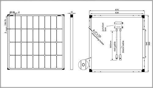 [technische Daten] Nennleistung(Pmax): 80W — max. Spannung(Vmp): 18,5V — Max. Strom(Imp): 4,34A — Leerlaufspannung(Voc): 22,80V — Kurzschlussstrom(Isc): 4,67A — Max. Systemspannung: 1000VDC — Betriebstemperatur.: -45°C bis +85°C — Abmessung: 690*670*35mm –Gewicht: 5,40KG