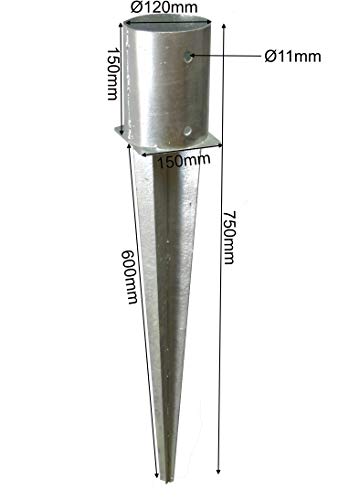 Abmessungen Pfostenaufnahme ca. 121 x 150 mm. Länge Erdspieß: ca. 600 mm. Gesamtlänge: ca. 750 mm