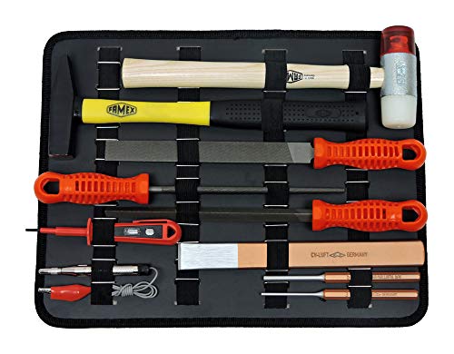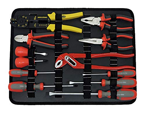 - Der Koffer beinhaltet zur Bildnis der Werkzeugbestückung 3 Werkzeugpaletten mit flexiblen Haltebändern, sowie eine Universalpalette im Kofferdeckel. Alle Paletten sind herausnehmbar.