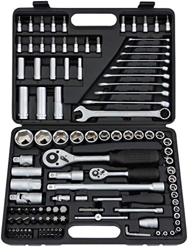 das Set enthält zudem einen 110-teiligem Steckschlüsselsatz, Steckschlüsseleinsätze mit Flanc-Drive System, 4 – 32mm, matt verchromt, in Kunststoffkoffer
