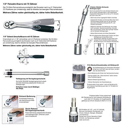 zudem per 15 GabelRingschlüsseln, Spannungsprüfer 6-400V, 19 Winkelschraubendreher zugunsten Sechskant und Torx, 3 Abfeilen, 2 Hämmer, Zollstock, Rollbandmass 5m – das Set enthält den 174-teiligen Steckschlüsselsatz FAMEX Nr. 525-21