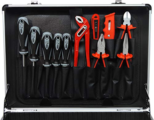 Inhalt: 4 Zangen, Hammer, Wasserwaage, 5 Schraubendreher, 10 Gabel-Ringschlüssel 6-19mm, 8 Innensechskantschlüssel, Spannungsprüfer 230V, 2 Abreiben, Rollbandmaß im Übrigen mehr