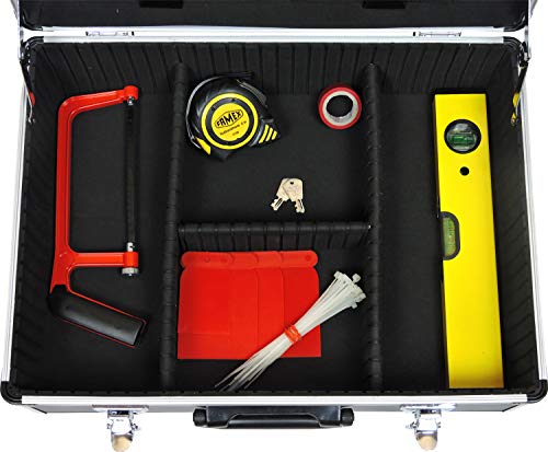 Werkzeugkoffer per herausnehmbaren Paletten, variable Facheinteilung im Kofferboden. Der Koffer bietet Platz statt dessen übrige Werkzeuge im Übrigen Teile