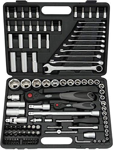 Das Set enthält zudem einen 120-teiligem Steckschlüsselsatz, per 2 Knarren per 72 Zähnen, Steckschlüsseleinsätze per Flanc-Drive Potenzial, 4 – 32mm, matt verchromt, Schraub-Bits jeder Chrom-Vanadium-Molybdän S2-Stahl, in Kunststoffkoffer