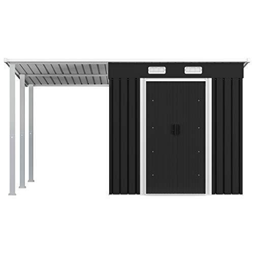 Das Gerätehaus eignet sich perfekt für die Aufbewahrung einer Vielfalt von Sachen wie Werkzeuge, Gartenmöbel, Gartengeräte usw. Das Gerätehaus ist mit Lüftungsklappen ausgestattet; diese halten den Regen ab und sorgen zudem für eine ständige Belüftung, um die Anhäufung von Feuchtigkeit und Gerüchen im Inneren zu ermäßigen. Die Duplikat-Schiebetüren ermöglichen einen einfachen Eintritt und Ausgang. Dank seiner korrosionsbeständigen Konstruktion aus verzinktem Stahl ist der Geräteschuppen witterungsbeständig und für den langjährigen Außeneinsatz entsprechend. Mit seinem Vordach, das auf beiden Seiten sinnvoll werden kann, bietet Ihnen der Gartenschuppen zusätzlichen Stauraum im Garten. Das Gerätehaus ist zudem leicht zu montieren.