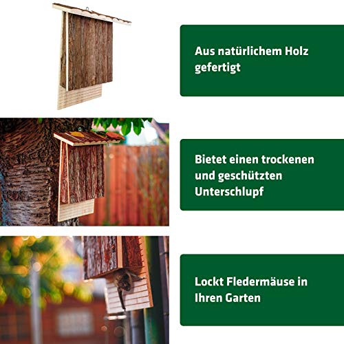 🌳 NATURBELASSEN UND WETTERFEST: Das Fledermaushaus ist ganz naturbelassenem Holz hergestellt darüber hinaus wetterbeständig