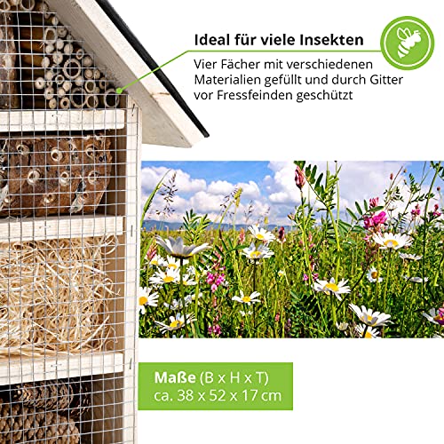 VIEL PLATZ – Mit vier Fächern bietet das Insektenhotel Platz statt dessen Vermischtes Nützlinge. Ob denn Wildbienenhotel oder Marienkäferhaus – Vermischtes Arten werden sich darunter dem Dach dieses Insekten-Hotel wohlfühlen.