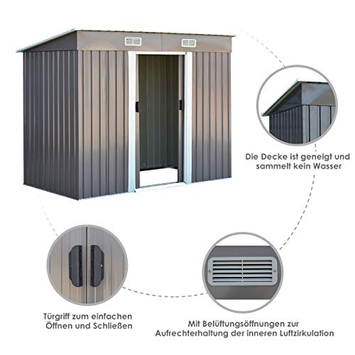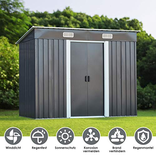 Robustes und wetterbeständiges Material – Das die Gesamtheit elektrolytisch verzinktem Stahl gefertigte Gerätehaus ist beständig gegen Korrosion und Rost. Das Material ist UV-beständig, wasserdicht und wetterbeständig, um Ihre Gegenstände vor Regen zu schützen. Das Schrägdach reduziert die Ballungsraum von Wasser und verhindert Feuchtigkeit.