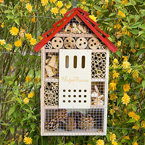NATÜRLICH & REGENGESCHÜTZT: Das überstehende Dach schützt das Insektenhaus vor Feuchtigkeit. Die Füllmaterialien – Holz, Holzwolle, Bambusrohre anhand ca. 3mm – 8mm Durchmesser, Tannenzapfen – sind auf die unterschiedlichen Bedürfnisse der Insekten harmonisch. Es eignet sich zum Aufstellen oder Aufhängen im Garten und auf dem Balkon.