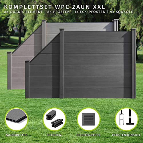HORI® WPC-Zaun XXL I Sichtschutz-Zaun, Steckzaun, Gartenzaun Komplettset I beidseitig glatt I 8x Quadr. + 8x Pf. + 1x…