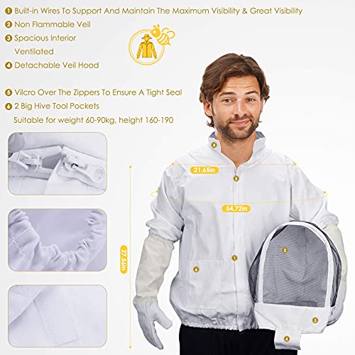🐝【Imkerjacke & Schleierhülle & Handschuhe】- Die Imkerjacke besteht aus Baumwolle und Polyester, geringes Gewicht, gute Luftdurchlässigkeit, mit abnehmbarem Schleierbezug, Handschuhe aus strapazierfähigen Baumwollärmeln und Ziegenleder, Kann Bienenstiche und Angriffe vorbeugen , bieten perfekten Abschirmung, Komfort und Anpassungsfähigkeit. Der Schutzanzug hat 2 große Taschen zum Verstauen von Wabenwerkzeugen (brauchbar für Personen mit einem Gewicht von 60-90 kg und einer Körpergröße von 160-190 cm)