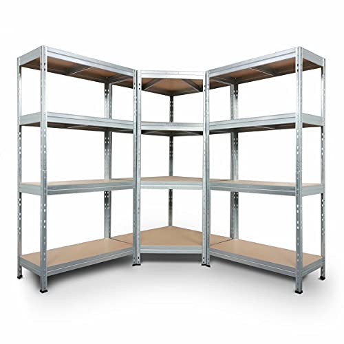 Dieses komplette verzinkte Regalsystem sämtliche Metall besteht sämtliche einem Eckregal mit den Maßen 180x90x45x64,5cm und zwei RIVET Steckregalen mit den Maßen 180x90x45cm.