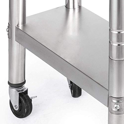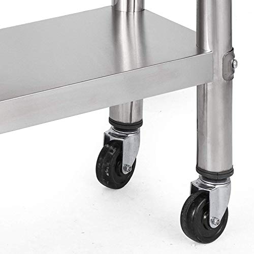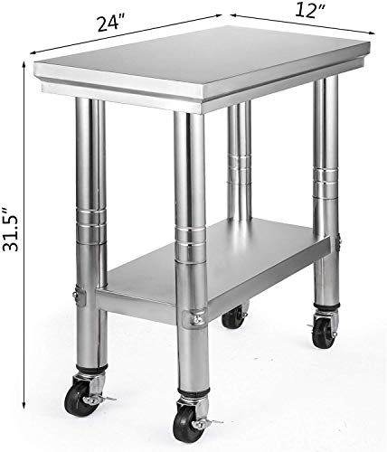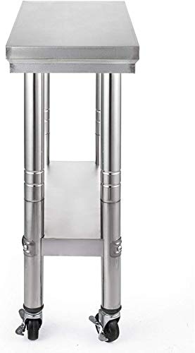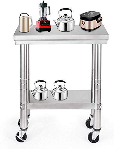 Stainless Steel Work Table 36×24 Inch with 4 Wheels Application The listing is about a superior Stainless Steel Commercial Kitchen Work Table. Constructed by durable stainless steel, 36×24 inch table size with 4 caster wheels, it is very safe to use, and is very easy to clean! Characteristic Brand new with top quality Commercial kitchen work table Constructed from stainless steel 36×24 Inch work table size Caster wheels feature with locking brake Adjustable feet to compensate for uneven floor Easy to set up and clean Perfect work surface for commercial setting Specifications Product: Work table Material: Stainless steel Work table size: 90×60 cm (36×24 inch) Height: 80 cm (31.5 inch) Adjustable Height: 2 cm (1 inch) Application: For kitchen, restaurant and other commercial application Package Length: 97 cm (38.19 inch) Package Width: 69 cm (27.17 inch) Package Height: 15 cm (5.9 inch) Gross Weight: 16.53 kg (36.44 lbs) Package Content 1x Work Table 36×24 Inch 4 x Caster Wheels 1 x Kit of Necessary Pieces