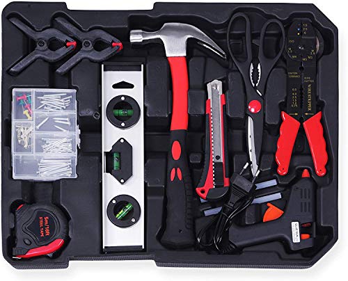 SET 1: Dieses Set enthält – 1x Kabelschuh Presszange – 1x Universalmesser – 1x Klauenhammer – 1x Schere – 1x Heißklebepistole – 2x Patrone – 1x Wasserwaage – Zeichenmaßstab – 1x Maßband 5m – 1x Isolierband (schwarz) – 2x Kunststoffklammern – 1x Kleinteilesortiment