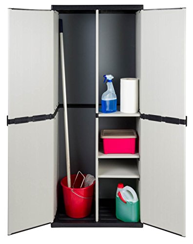Spindschrank: dieses Modell ist mit praktischem Freifach ausgestattet. Verstauen Sie ganz einfach auch Ihre sperrigen Gegenstände, wie z.B. Besen, Rechen, Wischmob, Staubsauber, u.a. in dem praktischen Freifach. Auf der gegenüberliegenden Seite finden Ihre anderen Utensilien Platz auf insgesamt drei Einlegeböden, davon zwei in der Höhe verstellbar.