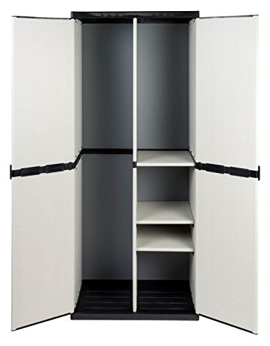 Tolles Schrank-Set bestehend aus zwei robusten Kunststoffschränken. Sowohl der Spindschrank als auch der Nischenschrank mit Böden ist aus hochwertigem und robustem Kunststoff (PVC) und besticht insbesondere durch seine Doppelfunktion als Indoor- und Outdoor Schrank durch die Spritzwassergeschützte Boden- und Deckelplatte. Die gut schließenden Türen und passgenauen Seiten- und Frontmodule schützen gut vor dem Eindringen von Feuchtigkeit.