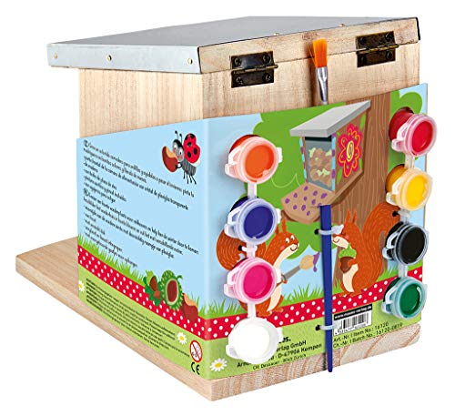 Der Futterplatz für Eichhörnchen kann mit den 8 Acryl-Farben und dem Pinsel individuell gestaltet werden – eine schöne Geschenkidee und Dekoration für den Garten