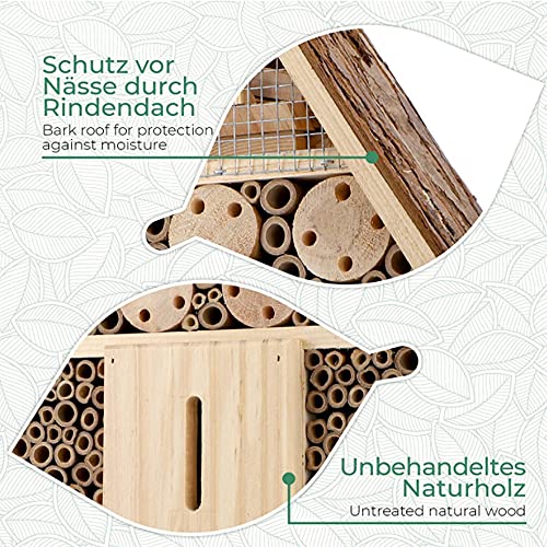 GANZJÄHRIG WETTERSICHER: Das Insektenhotel mit wetterfestem Rindendach ist ganz massivem Naturholz gefertigt. Es verfügt über mehrere Brutkammern mit entsprechenden Füllmaterialien. Das Insektenhaus eignet sich denn Überwinterungs- und Nisthilfe für Bienen und andere Insekten.