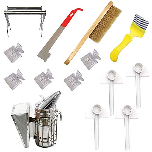 Imkerei-Werkzeug-Set enthält eine Bürste, einen Bienenstock-Räucher, einen Honigschaber, eine Metallrahmen-Klemme, 4 Eingänge-Futterspender für die Imkerei, 5 Imkerei-Klemmen und eine Abdeckgabel. Imker-Zubehör-Set ist die perfekte Stimmabgabe für professionelle Imker oder Nichtfachmann.