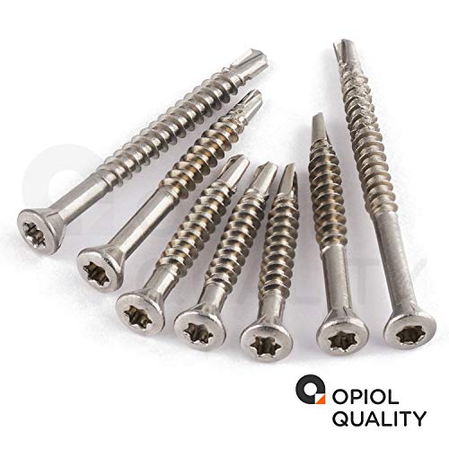 Der Torx-Antrieb ermöglicht das Anziehen eines hohen Drehmoments ohne Verschleiß, eine hohe Zugfestigkeit und geringe Materialverformung. Diese Dielenschrauben zeichnen sich durch den besonders kleinen Linsenkopf im Durchmesser, der Bohrspitze und den Fräsrippen aus.