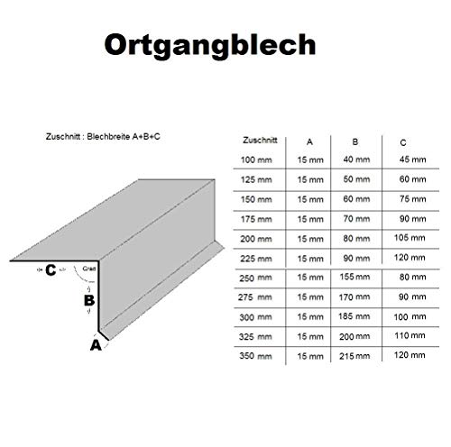 Material: Stahl feuerverzinkt Oberfläche: glatt, einseitig RAL 7016 Anthrazitgrau mithilfe Schutzfolie Gewicht: ca. 6 kg/m² Stärke: 0,75 mm. Ortgangblech in 2 Meter Länge gekantet ohne Befestigungsmaterial. Die Maße entnehmen Sie bitte der Skizze. Zuschnitt = A+B+C (Z:125mm/A:15mm+B:50mm+C:60mm)