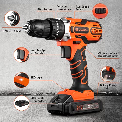 OUBEL Akkuschrauber/Akku Bohrschrauber 21V,Akku-Schlagbohrschrauber, Drehmoment 45N.m max,2x2000mAh Lithium Akku,3/8…