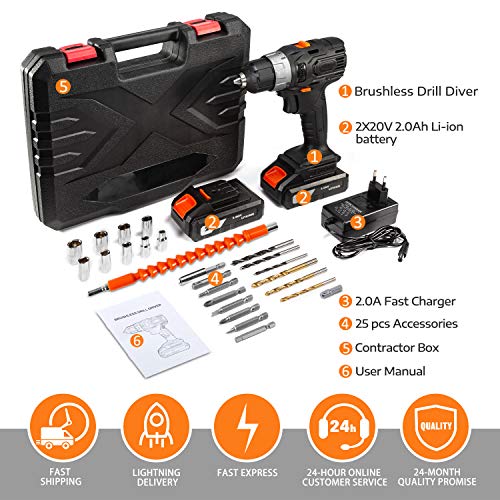OUBEL Bürstenloser Akkuschrauber, 20V 60Nm Akku Bohrschrauber Brushless Set 25Pcs, Bohrschrauber, 60Min Ladegerät…