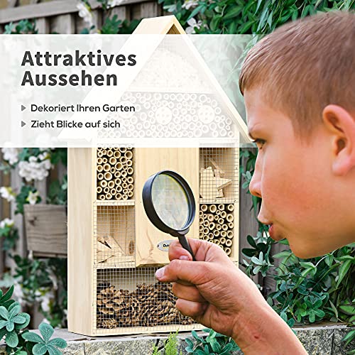 HILFT INSEKTEN: Dieses Insektenhaus lockt Bienen, Schmetterlinge, Ameisen, Blattläuse, Marienkäfer und eine Vielzahl anderer Insekten in Ihren Garten oder Hinterhof und bietet ihnen einen Unterschlupf zum Verweilen. Die Insekten werden sich über die zahlreichen Nistmöglichkeiten freuen, um den Winter oder Regentage zu überstehen.