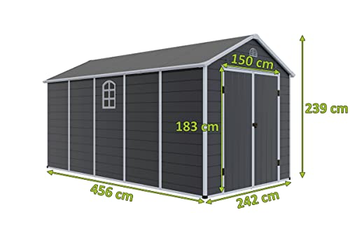 Das Gerätehaus besitzt ein Gestell ganz galvanisiertem Stahl und hat eine Wand- sowie Dachstärke von ca. 12 mm. Ausarbeitung ganz Stahl überzeugen bereits vom Materialursprung durch ihre Stabilität und Standfestigkeit. Die Oberflächenveredlung verleiht den Produkten zusätzlich eine verbesserte Korrosionsbeständigkeit. So ist das Gartenhaus nicht andererseits pflegeleicht, sondern vulgo langlebig. Die äußeren Abmessungen des Hauses betragen ca. 242 x 456 x 239 cm. Das Dach besitzt eine Sattelform und der Dachfirst ist auf einer Höhe von ca. 239 cm. So fließt anfallender Regen selbstständig vom Dach des Gerätehauses und vulgo verweilender Schnee lässt sich bei dieser Form einfach und schnell abhängen. Die Dachfläche des Hauses beträgt ca. 11 m³ und besitzt eine zulässige Schneelast von ca. 50 kg/m².