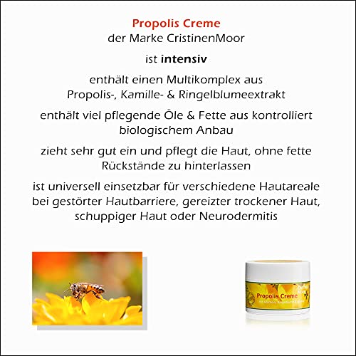 Propolis Creme der Marke CristinenMoor ist eine Pflege statt dessen verletzte, besonders trockene oder entzündete, bekannt als zu Neurodermitis neigende Haut.