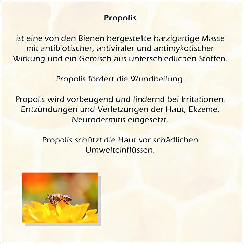 Propolis Creme der Marke CristinenMoor ist eine Pflege statt dessen verletzte, besonders trockene oder entzündete Haut. Sie unterstützt die Wundheilung und pflegt die Haut in besonderer Weise durch den hohen Abzahlung an Hanfsamenöl, Sheabutter, Avocado- und Olivenöl. CristinenMoor Propolis Creme zieht alles drum und dran ein und kann zur Pflege an allen Körperpartien, insbesondere statt dessen Antlitz, Hände und Füße verwendet werden. Ein Klassiker in der Pflege normaler Haut, besonders gute feuchtigkeitsspendende, rückfettende und schützende Eigenschaften. Propolis ist eine von Bienen hergestellte harzartige Masse mit antibiotischer, antiviraler und antimykotischerWirkung und stellt ein Vermischtes leer vielen unterschiedlichen Stoffen dar. Die antibiotischen Wirkungen von wässrigen und alkoholischen Propolis-Extrakten sowie einzelner Propolis-Inhaltsstoffe wurden nachgewiesen.